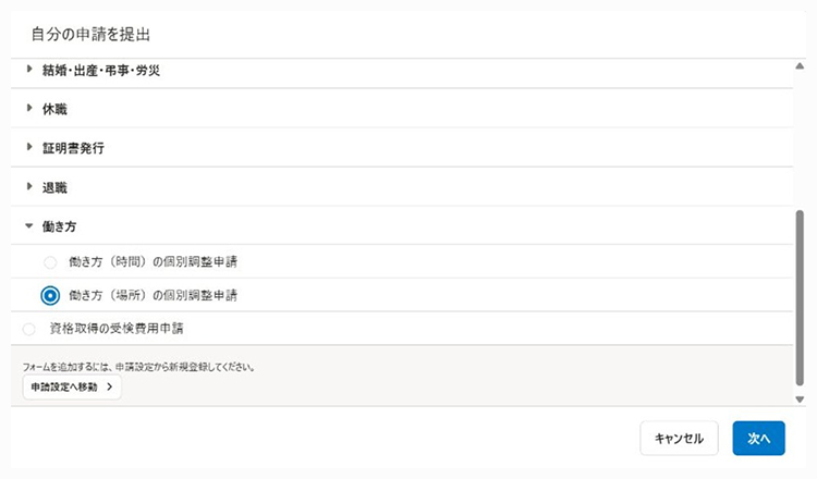 リモートワークが50%では足りない事情がある場合、働き方の個別調整申請を出していただきます。部長承認を経ることで、個々の事情が正式に記録され、全社で把握できる状態を作り上げました。