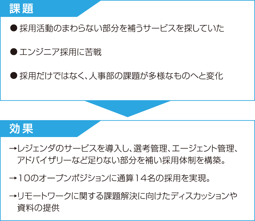 角野氏「レジェンダにお願いする前に複数社に話を聞きました。他社のサービスは、パッケージになっていて、それ以上でもそれ以下でもないという印象でした。ただ、これまでも自分たちで採用活動をしてきたため、自分たちでやりたいことはやりたい、という思いがありました。自分たちのスタイルを保ちながらも、足りないものを埋めていただける柔軟性があったレジェンダを選びました。」