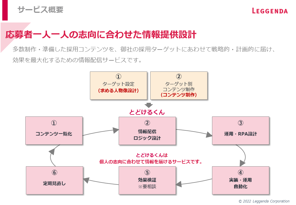 そこで、レジェンダ・コーポレーションは採用活動において候補者の求める情報を個別最適で配信し、候補者の選考参加意欲・入社意欲を高めるRPAツール「とどけるくん」をリリースいたします。